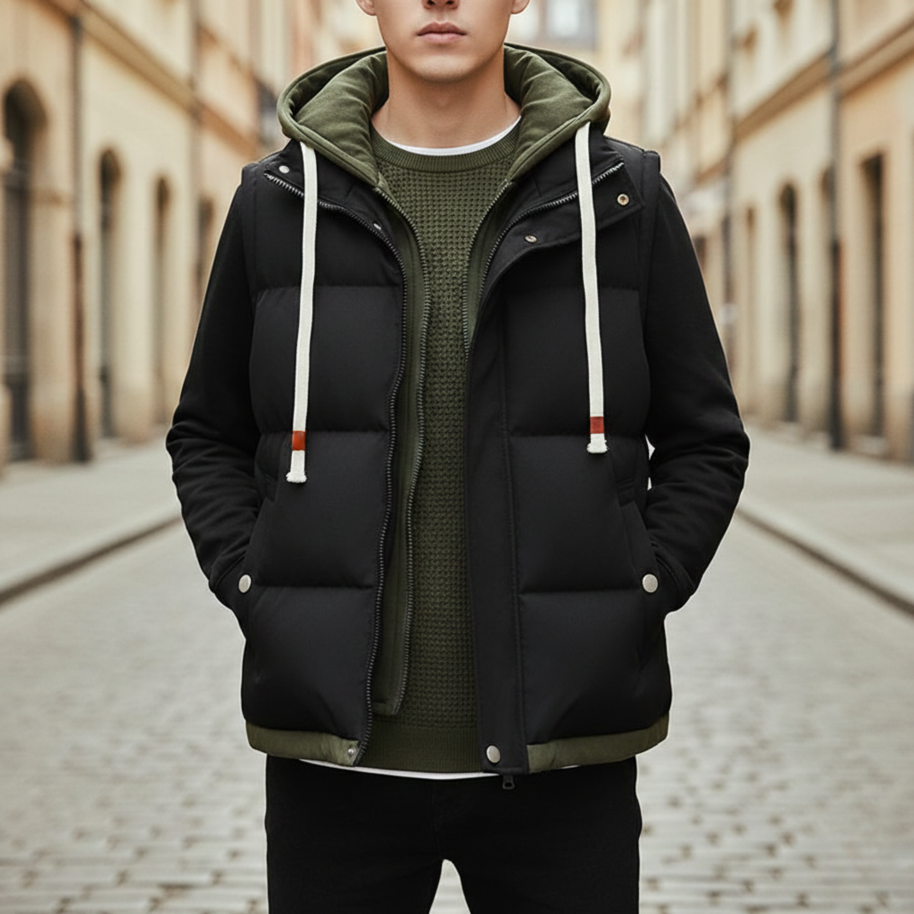 This versatile gilet features a lightweight padded construction with a smooth soft-shell exterior and a hooded lining for added warmth. Designed for layering, it offers a clean, modern silhouette with a full-zip front, practical snap pockets, and adjustable drawstrings. Ideal for transitional weather, the hooded puffer gilet delivers everyday styles over knits or hoodies for casual, outdoor, or city wear.