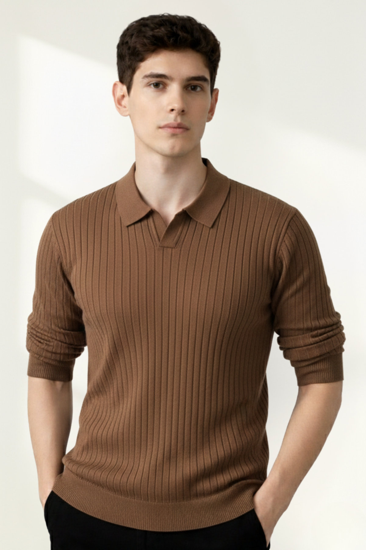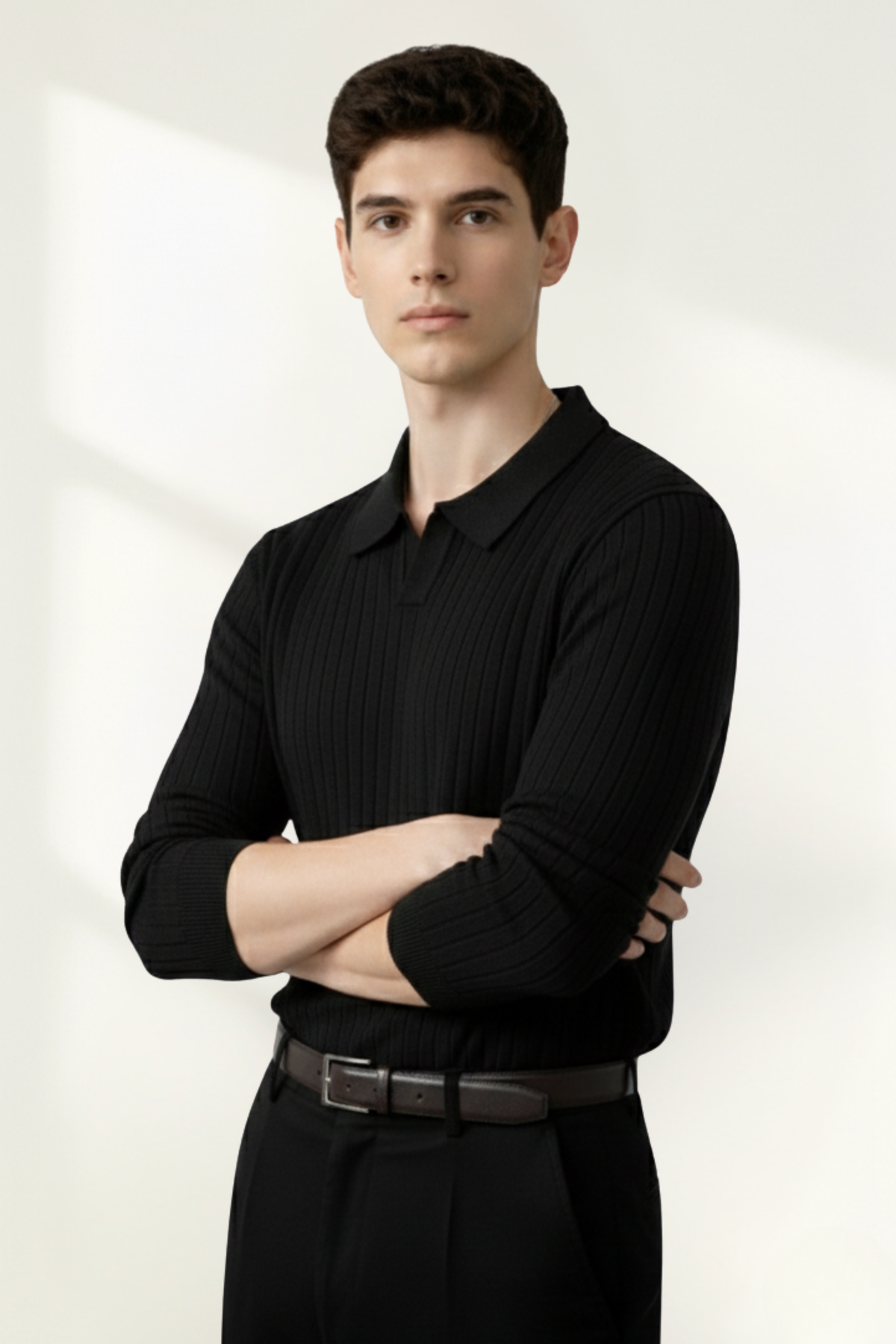 El suéter de polo de punto acanalado para hombres está diseñado para hombres adultos y es adecuado para el uso diario y smart-casual. Este suéter de polo de manga larga presenta una superficie de punto acanalado y colores sólidos. El diseño apoya su uso en entornos de trabajo casuales y ocasiones informales. Se combina con pantalones, denim o atuendos en capas.