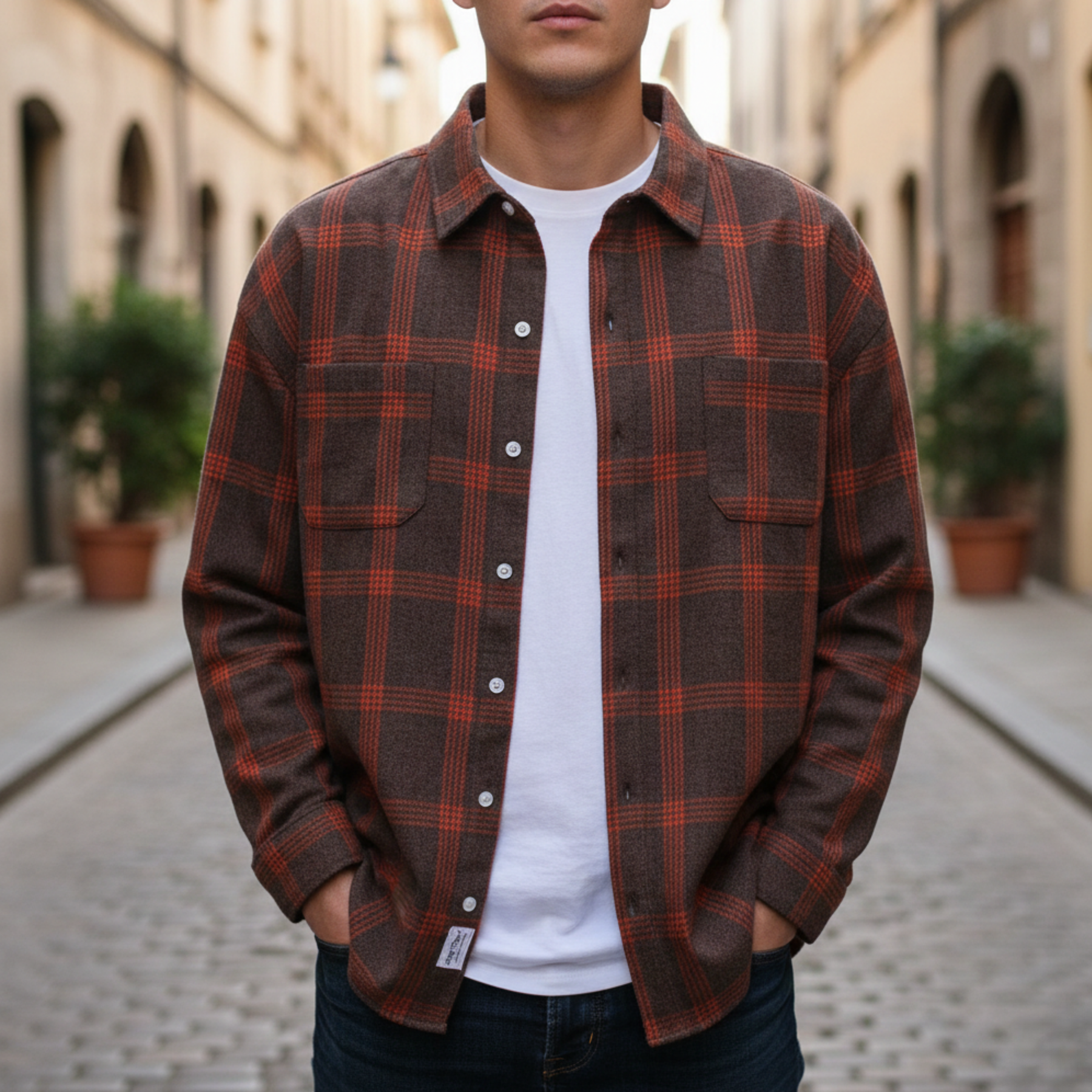Esta camisa de franela para hombres está diseñada para uso adulto y presenta un corte de manga larga con un cuello clásico y cierre frontal de botones completo. La camisa tiene un patrón a cuadros en tonos marrones y naranjas y está destinada para uso casual y diario. Se puede usar como una prenda independiente o sobre una camiseta en condiciones más frescas, lo que la hace adecuada para entornos relajados y temporadas de transición donde se prefiere un estilo de franela casual.