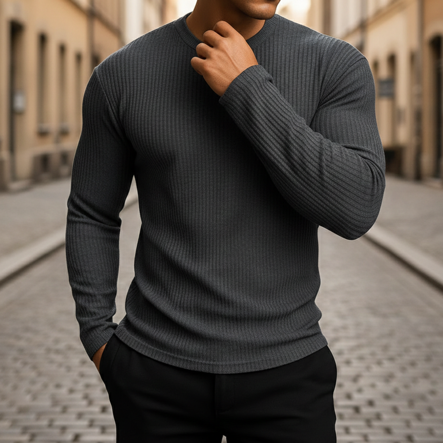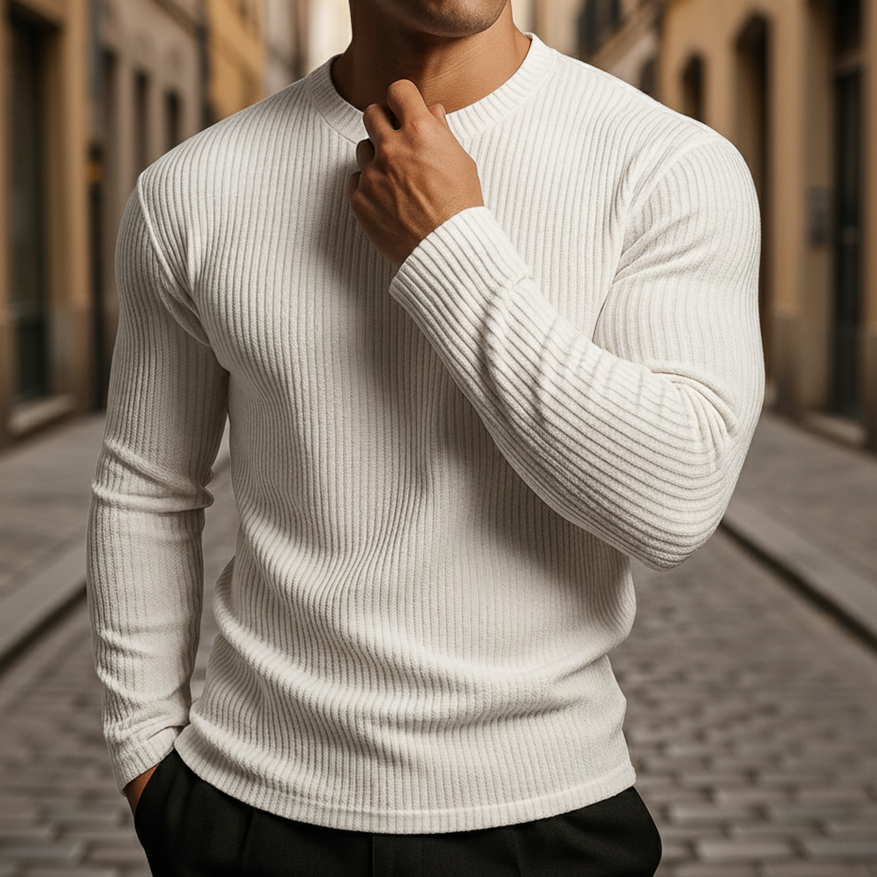 Este suéter de punto acanalado presenta un diseño de cuello redondo con mangas largas y una silueta ajustada. Hecho para hombres, tiene un patrón de canalé vertical texturizado que proporciona estructura y elasticidad. Adecuado para usar en capas o solo, se combina con jeans o pantalones para atuendos casuales y smart casual en temporadas más frescas.