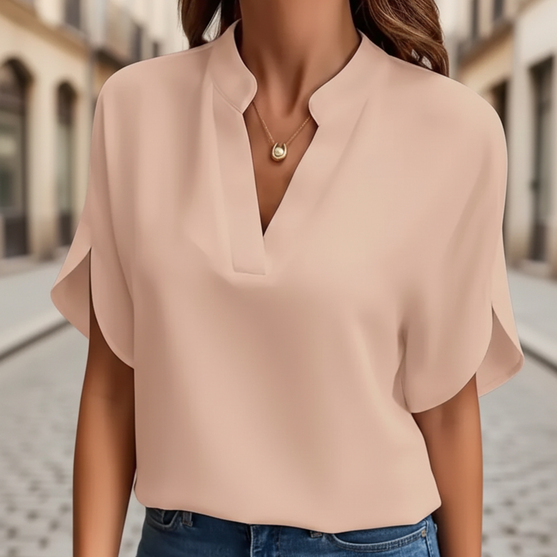 Blusa de Seda con Cuello en V de Manga Corta para Mujeres