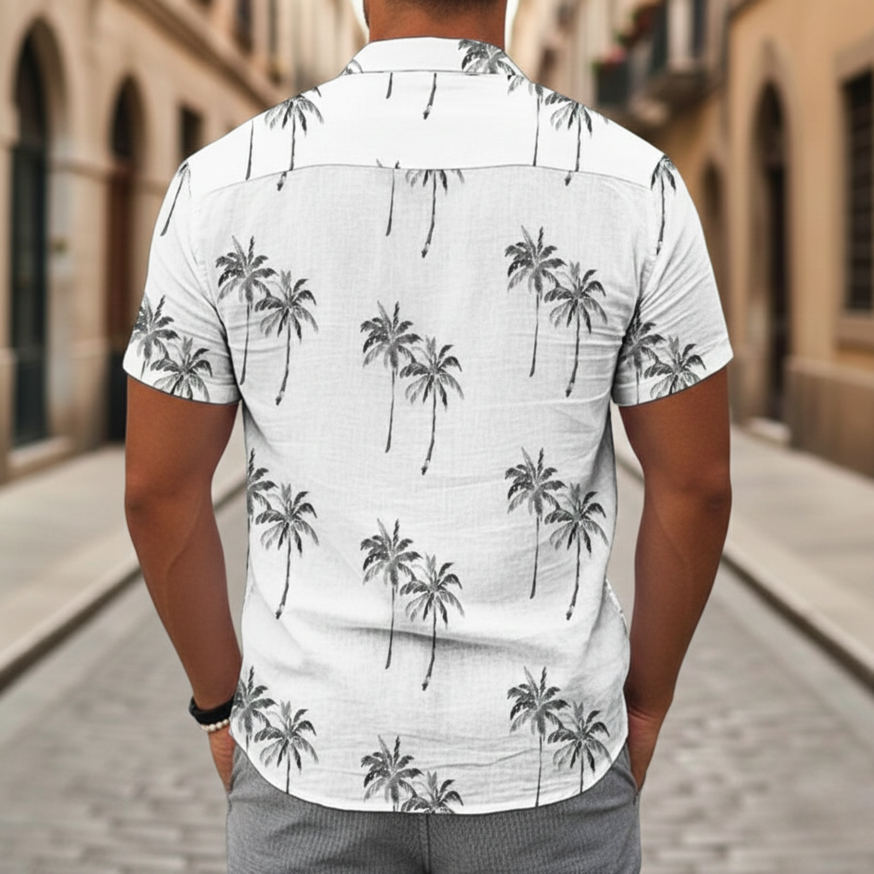 Cette chemise pour homme en lin et polyester présente un design à manches courtes avec une fermeture boutonnée sur le devant et un motif palmier imprimé sur toute la surface. Sa construction légère et sa coupe décontractée la rendent adaptée aux temps chauds et à la saison estivale. Conçue pour les hommes adultes, elle peut être portée ouverte ou fermée pour des sorties décontractées, des vacances ou un usage quotidien. Le tissu et l'imprimé tropical offrent un look saisonnier approprié pour les cadres de loisirs.