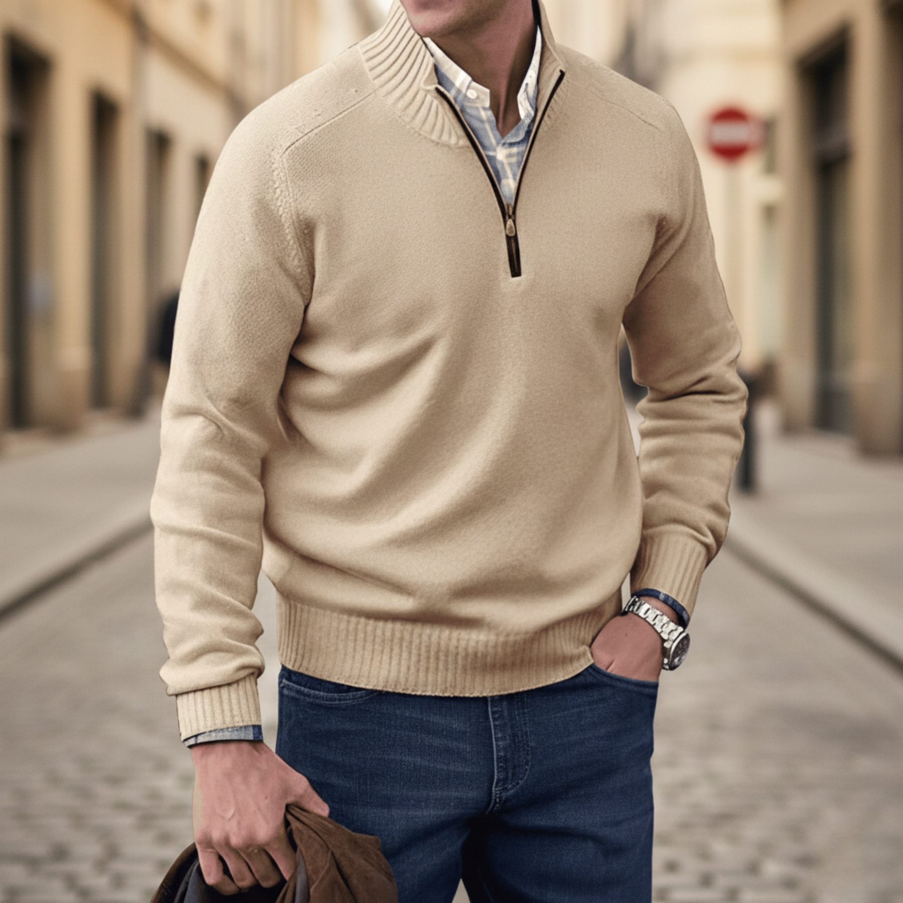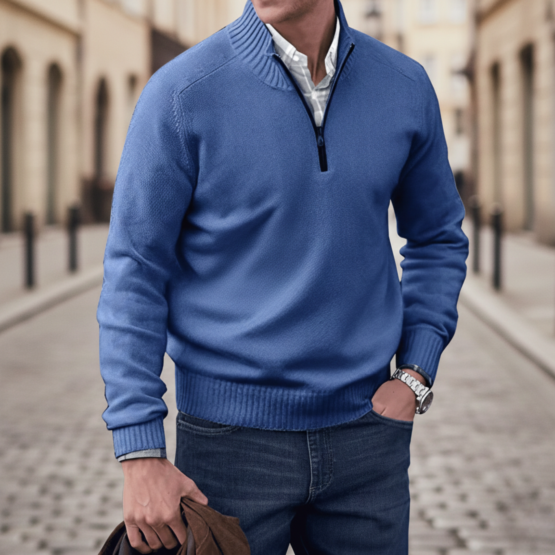 Le pull tricoté bleu pour hommes à fermeture quart de zip est conçu pour les hommes adultes et destiné à un port régulier pendant les saisons fraîches. Ce pull à manches longues présente une encolure à fermeture quart de zip et une construction tricotée en tissu mélange polyester et coton. Les couleurs permettent une coordination avec des tenues décontractées et smart-casual.