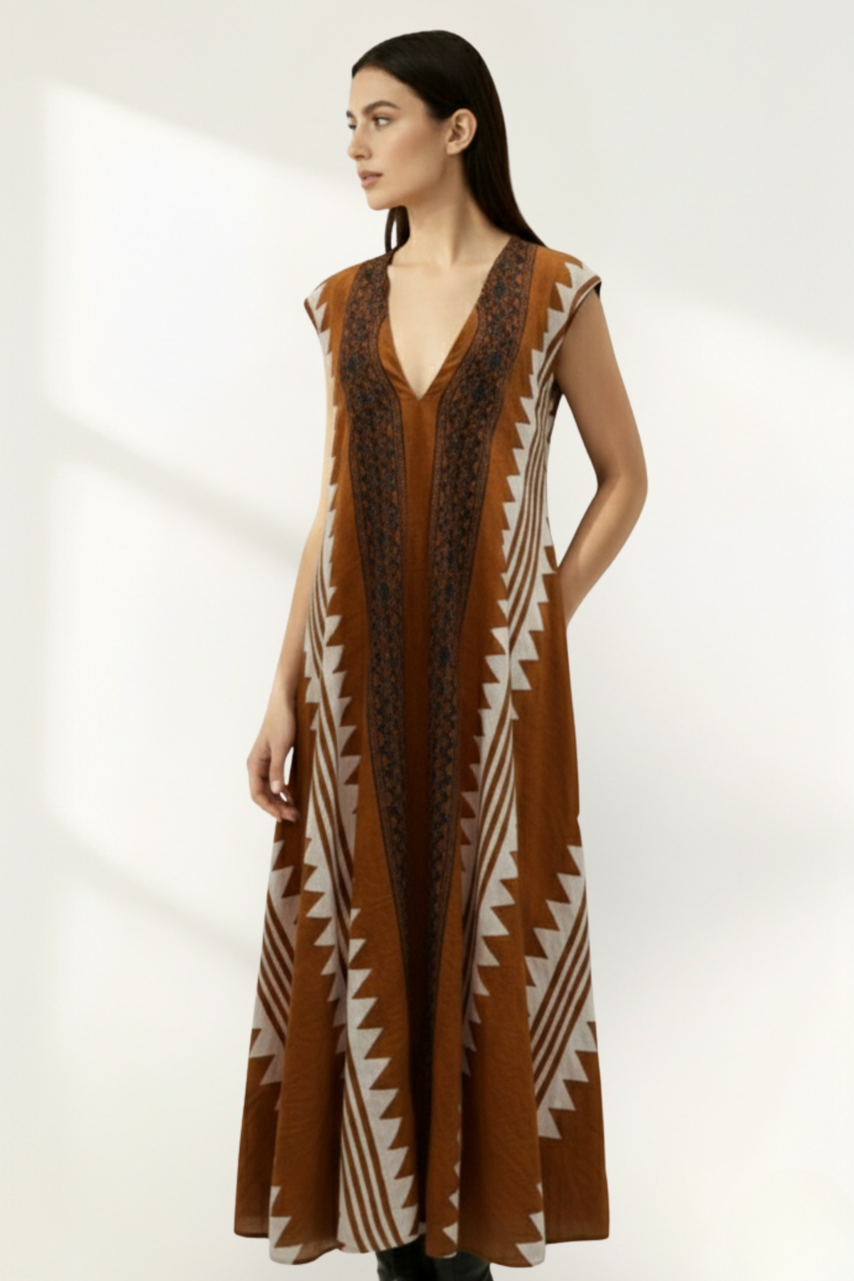 La robe présente une silhouette fluide qui offre une grande liberté de mouvement, la rendant idéale pour les événements en plein air ou le port quotidien. Son design bohème intègre des motifs complexes et des tons chauds et terreux, en faisant un ajout polyvalent à toute garde-robe.