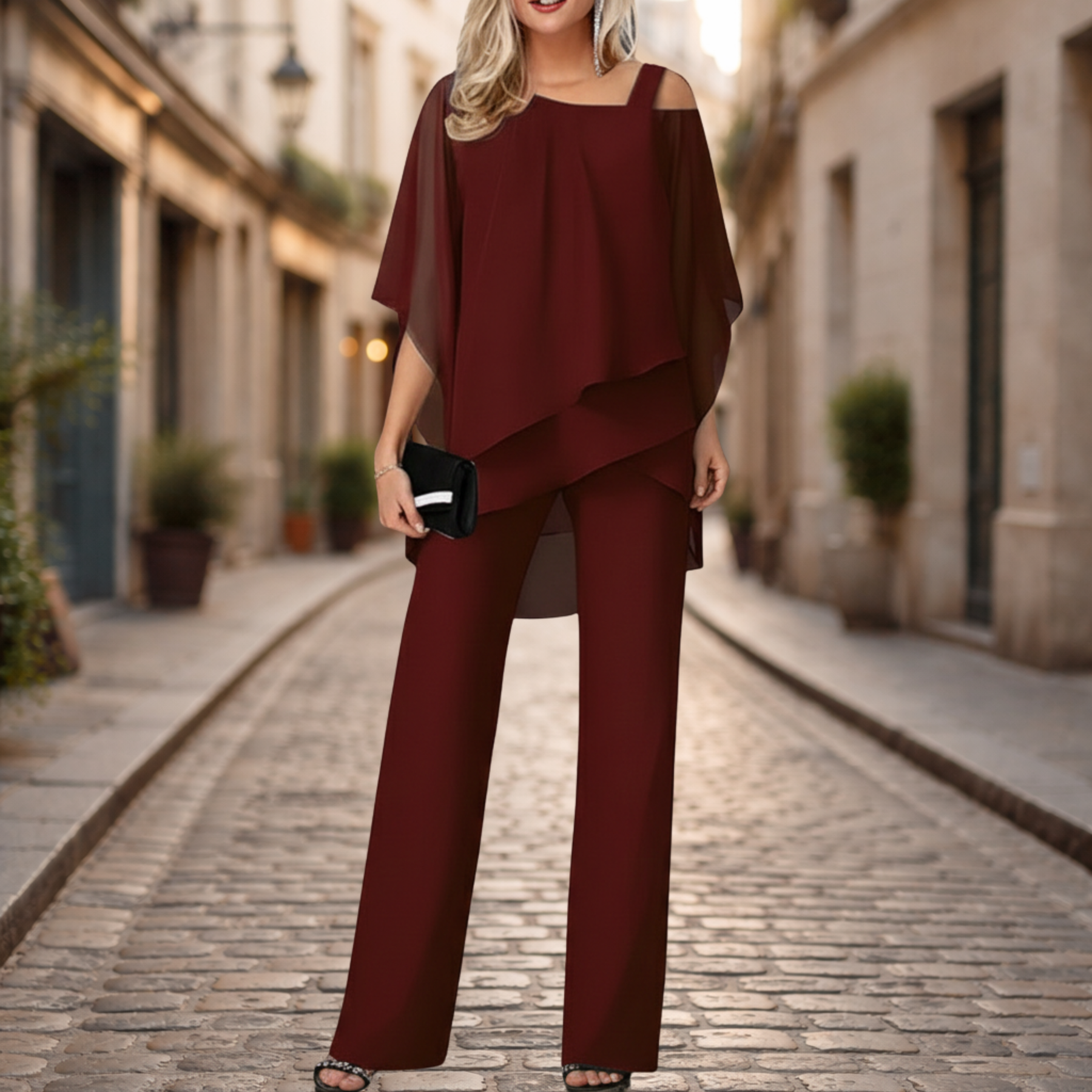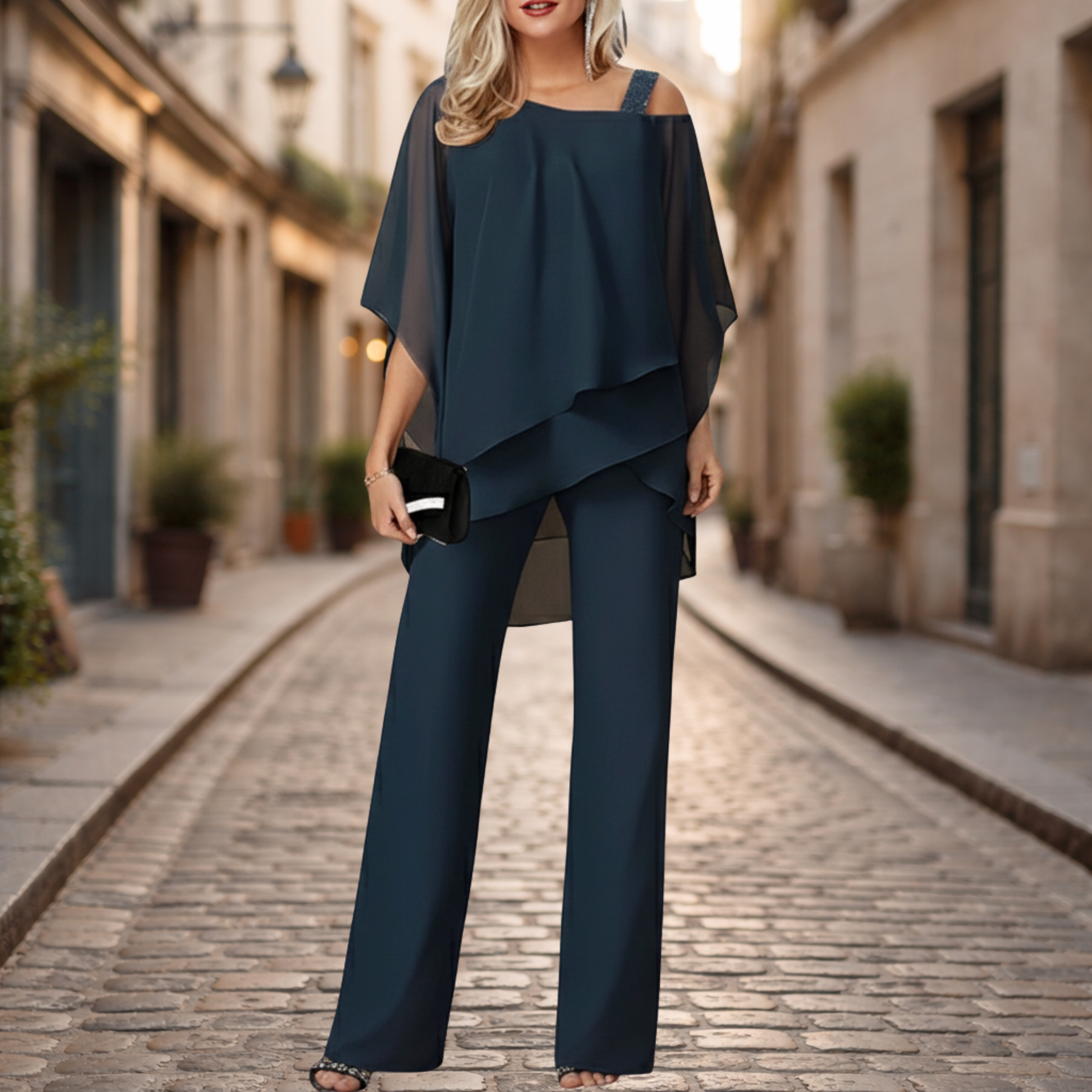 Ensemble en chiffon pour femmes conçu comme une tenue deux pièces avec un haut à couches et un pantalon assorti. Ce vêtement est porté pour des occasions en soirée et comprend un tissu en chiffon léger, une silhouette décontractée, une construction superposée asymétrique, et un pantalon coordonné longueur totale adapté à un usage formel saisonnier.