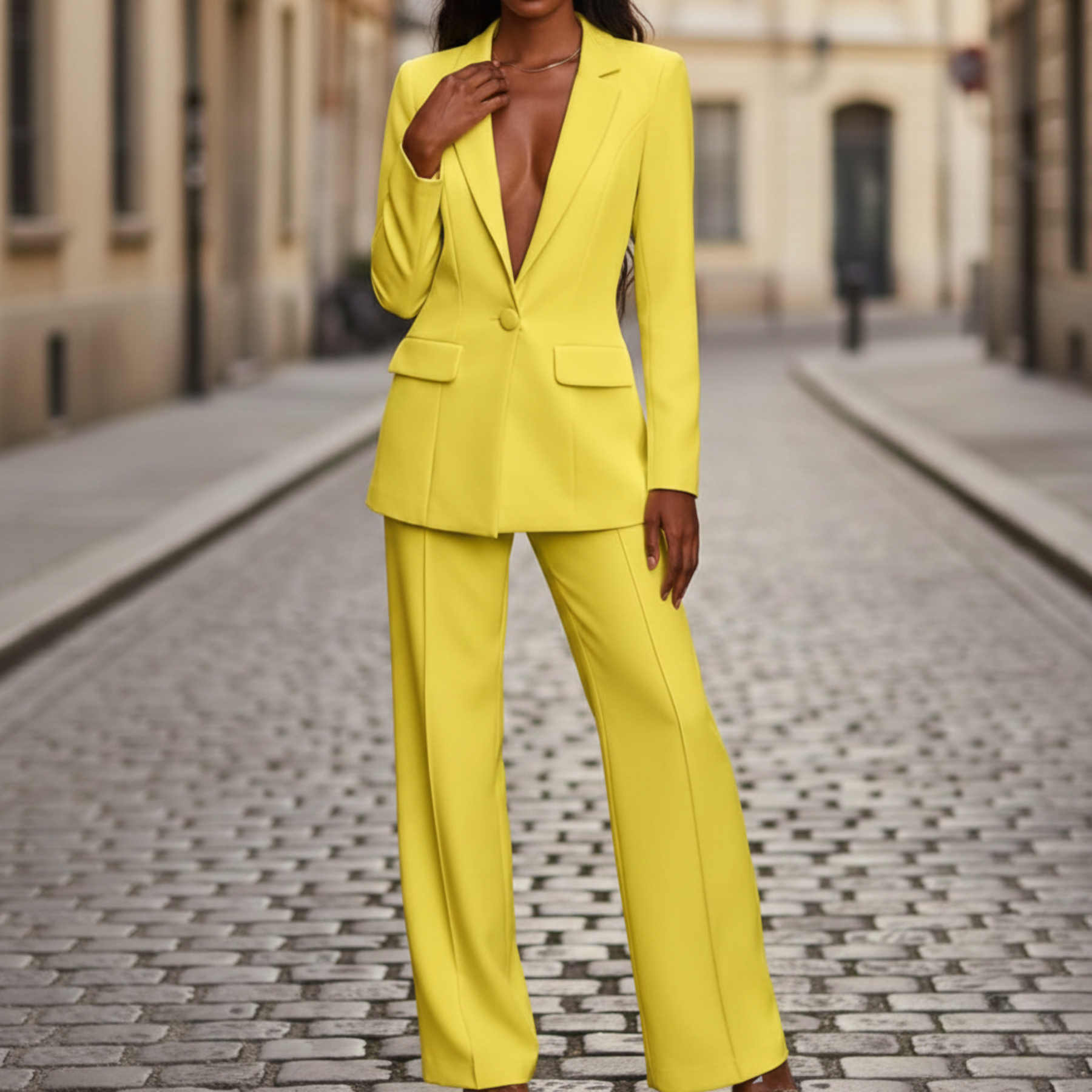 Ce tailleur pantalon pour femmes comprend un blazer ajusté avec un seul bouton sur le devant et un pantalon large assorti. L'ensemble présente une silhouette structurée avec des manches longues et un décolleté en V profond, adapté aux environnements formels et professionnels. Conçu pour l'automne et les saisons de transition, il peut être porté comme tenue de bureau coordonnée ou stylé séparément. Destiné aux femmes adultes recherchant un ensemble blazer et pantalon coordonné pour un usage professionnel ou événementiel.