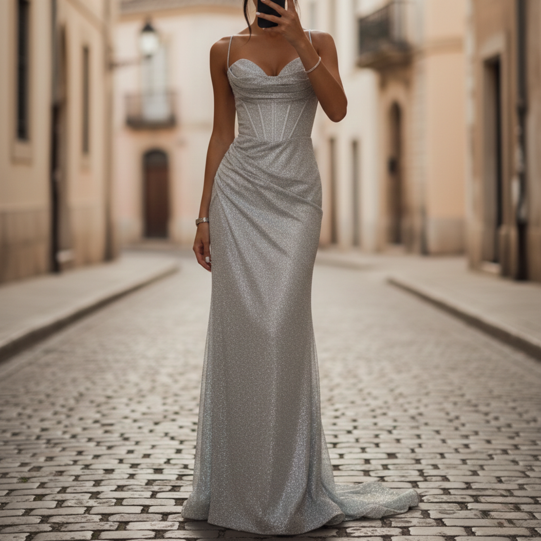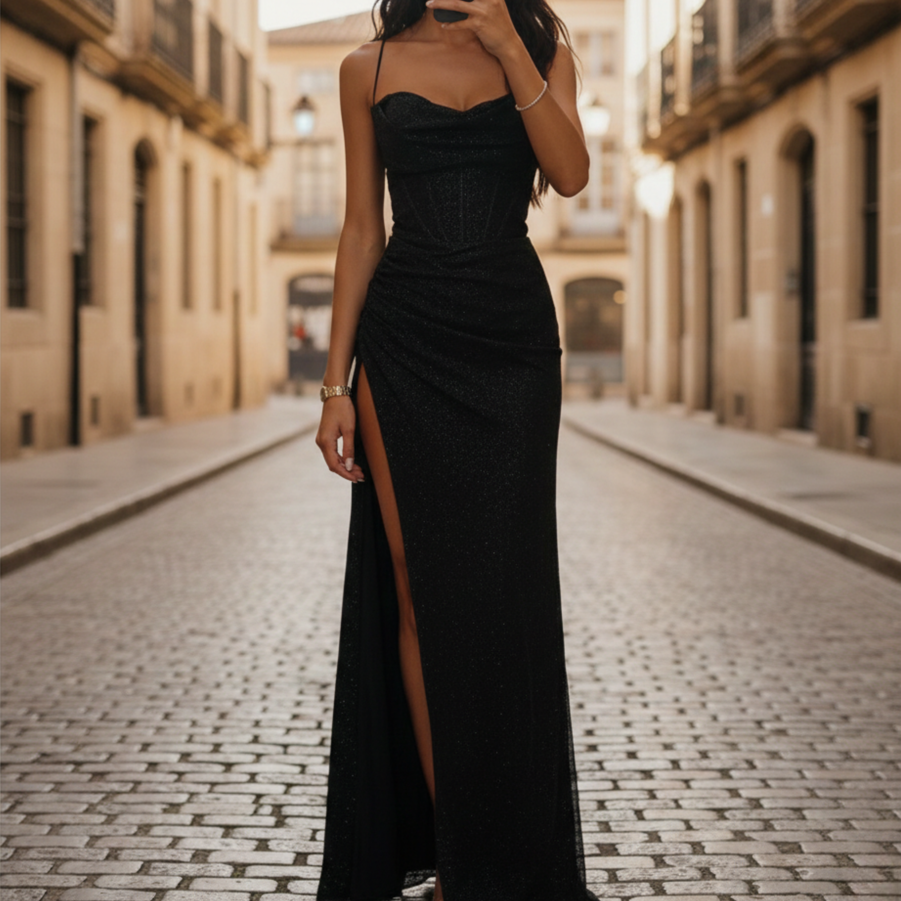 Cette robe de soirée pour femmes présente un design longueur maxi avec de fines bretelles spaghetti et une silhouette ajustée. La robe comprend un décolleté en cœur et une fente latérale haute pour faciliter les mouvements. Conçue pour l'automne et les occasions formelles, elle convient aux événements en soirée, aux fêtes et aux rassemblements spéciaux. Destinée aux femmes adultes recherchant une robe longue formelle à la coupe épurée.