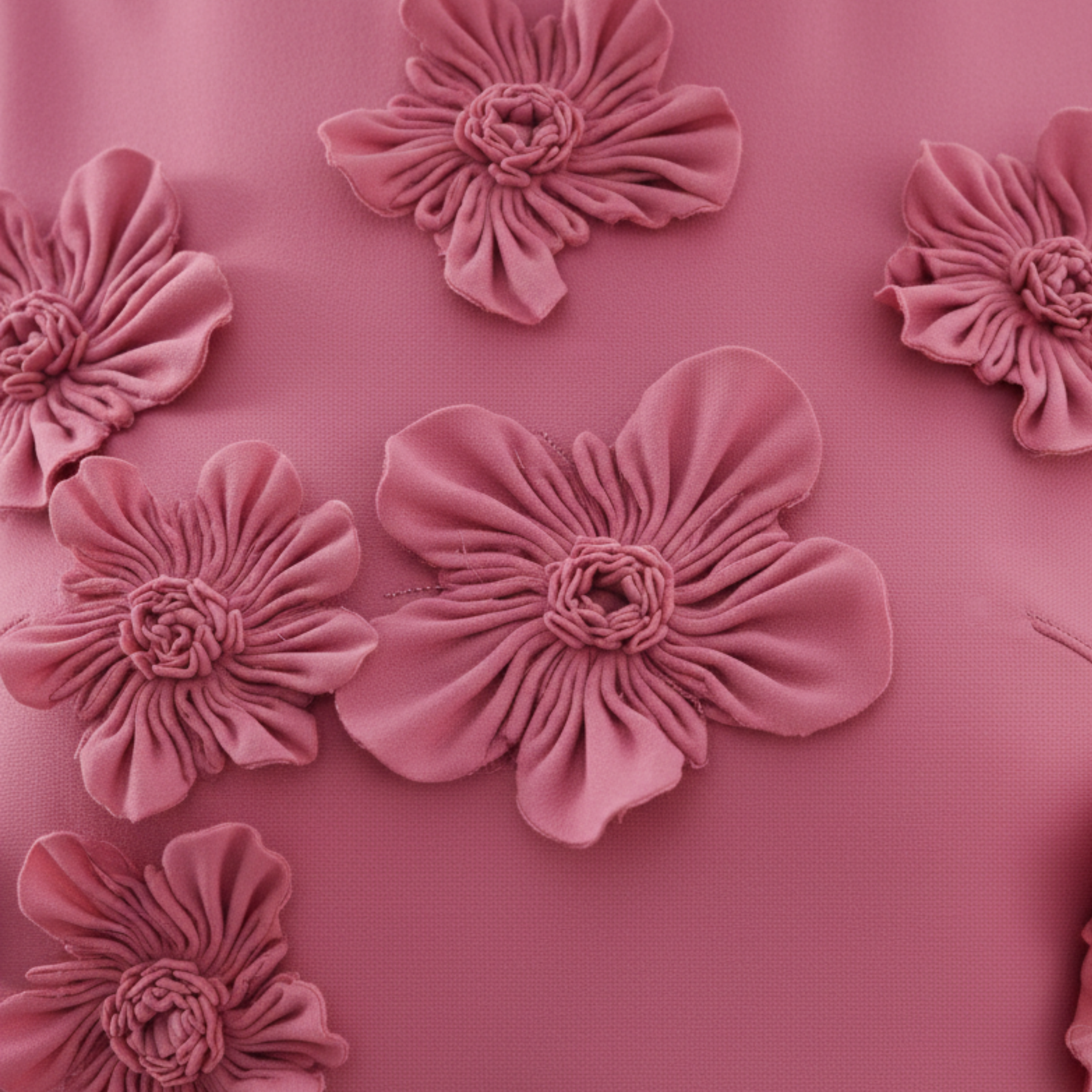 Cette robe de soirée pour femmes présente un design sans manches avec un col montant et une silhouette longue. Le tissu rose est orné de décorations florales sur le corsage et la jupe. Conçue pour les événements formels et les occasions spéciales, elle offre une forme structurée mais fluide, adaptée aux tenues de soirée.