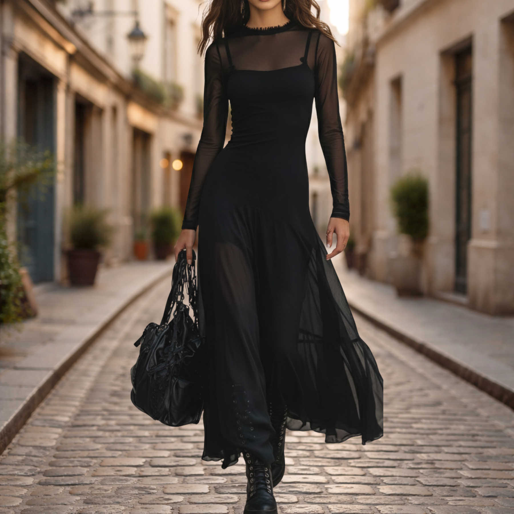 Robe maxi pour femmes conçue avec une silhouette ample et une construction en tissu tulle. Ce vêtement se porte comme tenue d'occasion ou de soirée et comprend des manches longues transparentes, un col rond, une jupe fluide, et une structure légère en couches adaptée à un usage saisonnier courant.