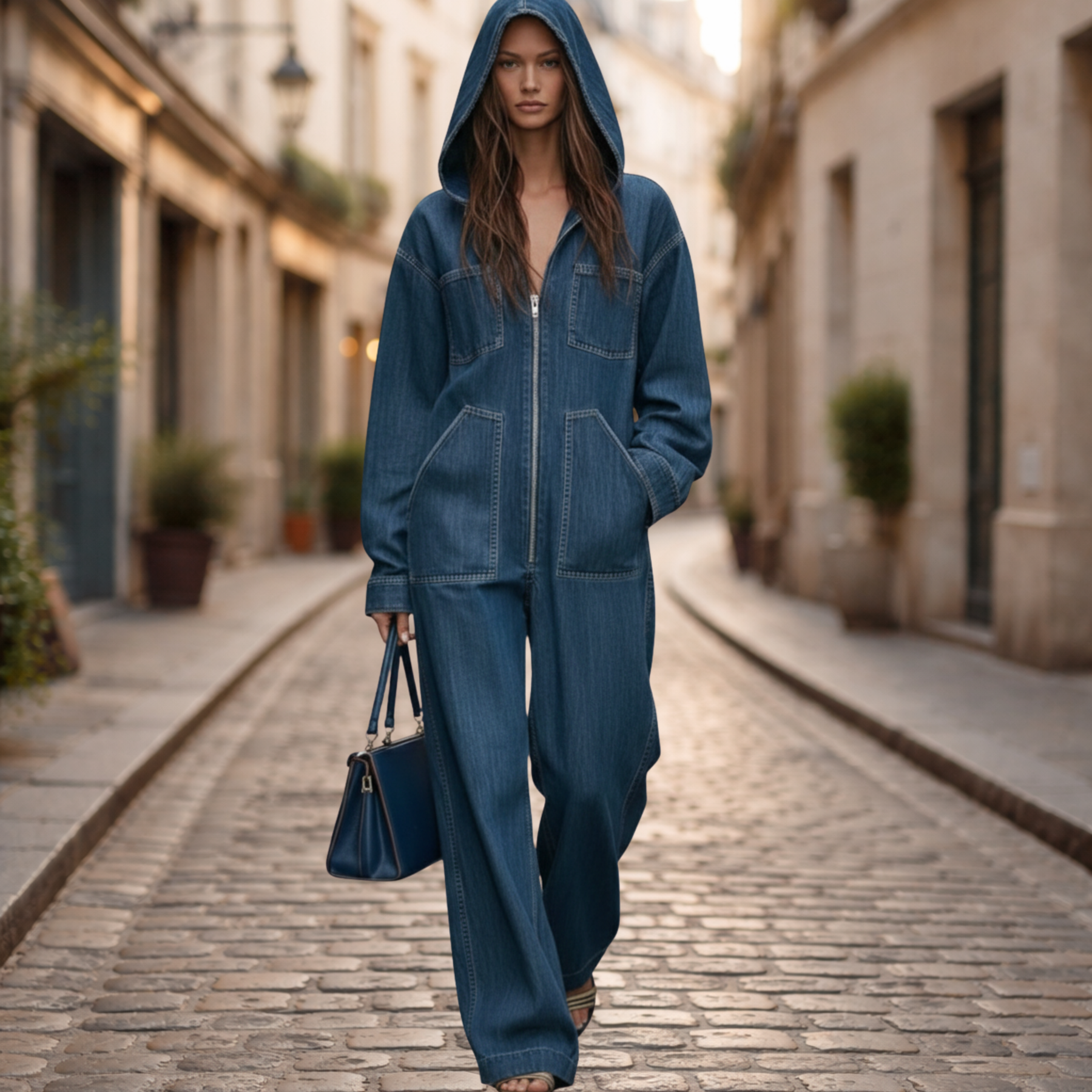 Combinaison en denim décontractée pour femmes conçue avec une capuche, des manches longues et une fermeture éclair à l'avant. Ce vêtement se porte comme un habit de tous les jours et comprend une coupe ample, des détails de poches, une forme de jambe pleine longueur, et une structure en denim tissé durable adaptée à un usage saisonnier régulier.