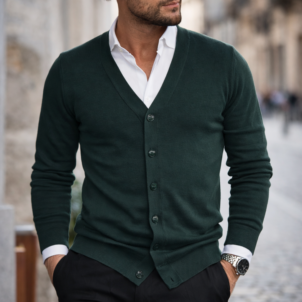 Men’s cardigan sweater designed with a button front closure and V-neckline in a timeless knit construction. This top layer includes long sleeves, ribbed hems, and a regular fit form suitable for layering over shirts or wearing as casual smartwear in cool weather.